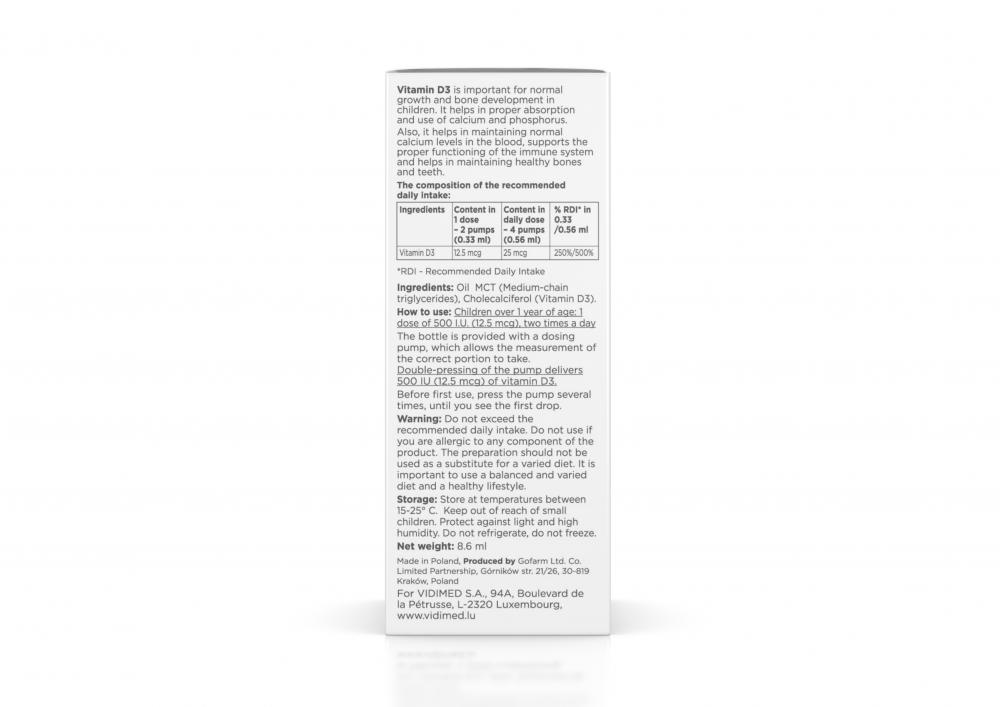 The recommended and most natural form of vitamin D is vitamin D3, which is the type that your body makes from sunlight. Vidal D3 drops contains 500 IU per dose (2 pumps).