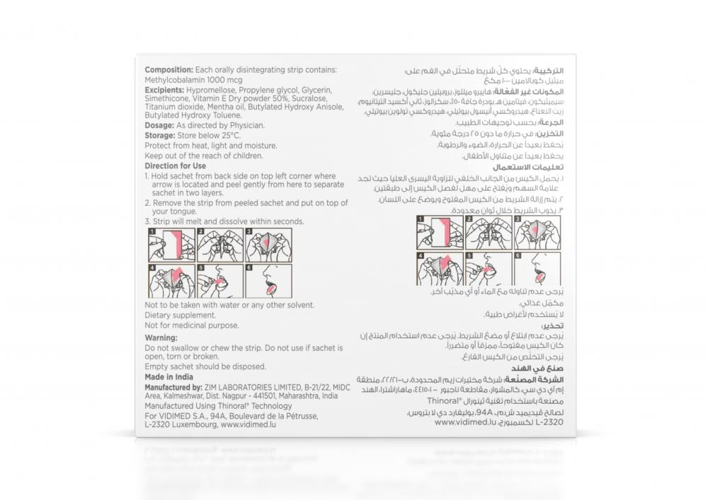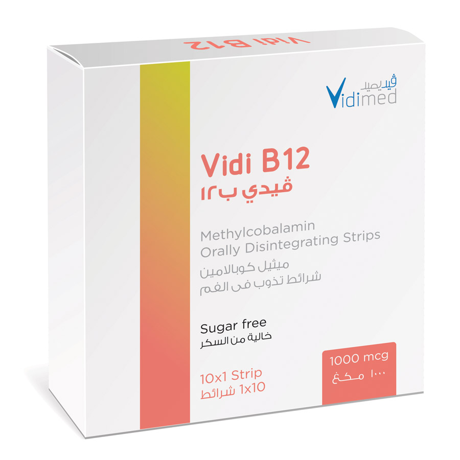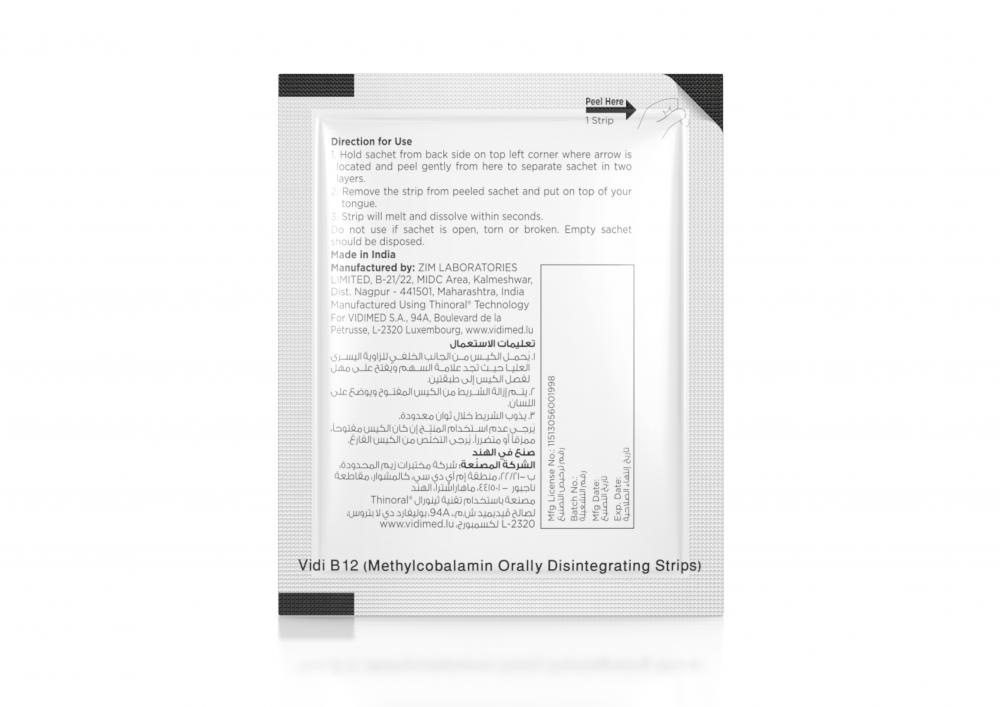 Vidi B12 contains 1000 mcg of highly absorbable vitamin b12 (methylcobalamin) in a mouth dissolving strip form.